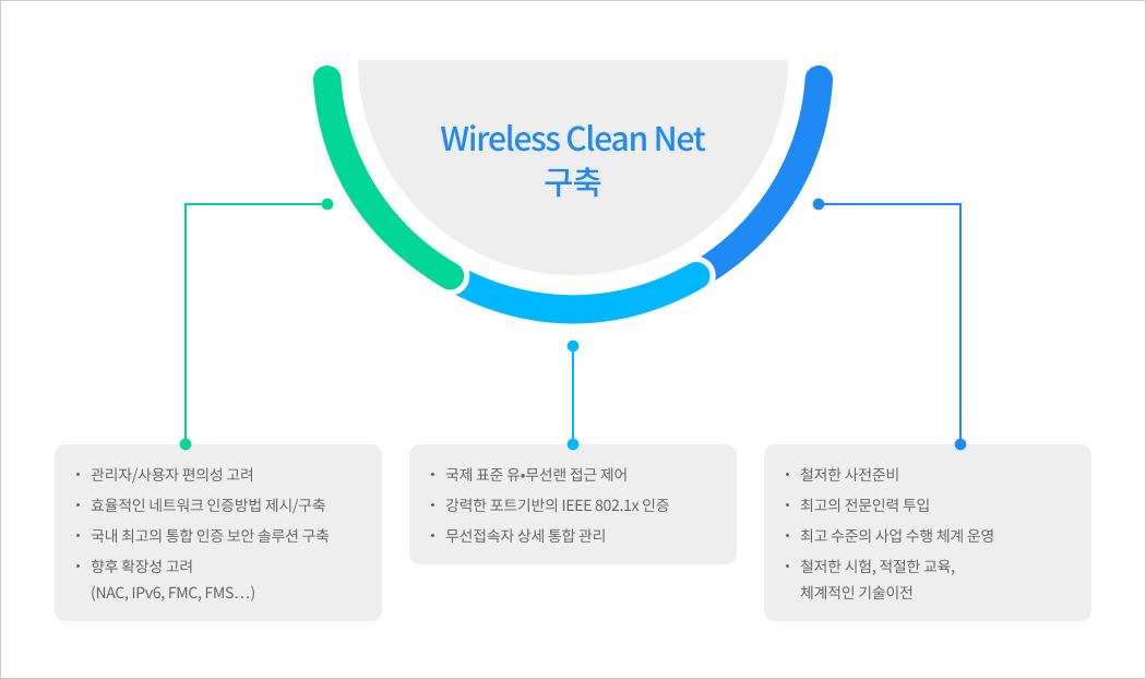 유•무선랜 통합 보안 인증 솔루션 구축 사업은 무선랜 네트워크 접근에 대한 강력한 보안 구현 및 국제 표준인 802.1x 또는 802.11i 인증방식을 적용으로 네트워크 장비활용을