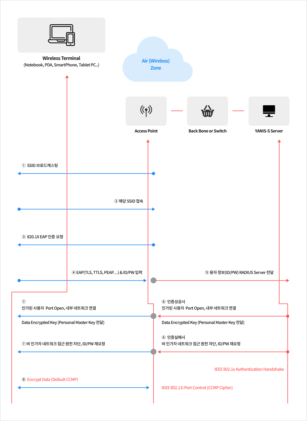 유/무선 통합 인증 솔루션으로 RADIUS 표준 프로토콜 기반의 AAA Server를 기본적으로 PC, NoteBook, PDA, SmartPhone, Tablet PC, FMS 등 과 같은